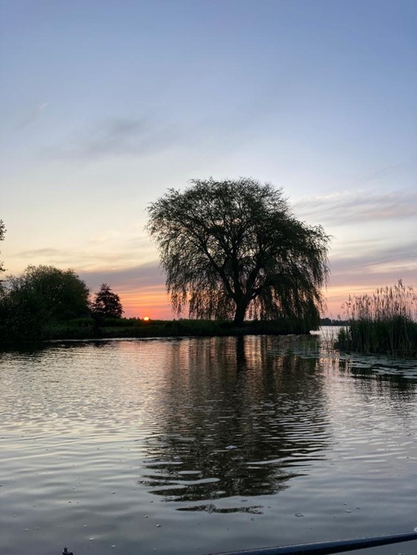 Nadat dit hersteld was, konden we dan toch vertrekken voor een rondje plas. Een kleine 20 minuten na vertrek kwam de zon langzaam op. Uniek was de stilte van de omgeving. Deze werd enkel onderbroken door vogelgezang en door het ritmische geluid van de riemen.