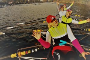 We pasten een belangrijke les van coach Theo van Catz goed toe: ‘ontspan tijdens de recover en laat die boot glijden’. Natuurlijk werd er ook hard getrapt door Christine Koetsier, Yvette Engbers, Annemieke van Agthoven en Marjo Broos. Maar elke keer als we de glijhaal even kwijt waren en Annet ons weer op scherp zette, liepen we weer een stukje verder uit op Pampus.