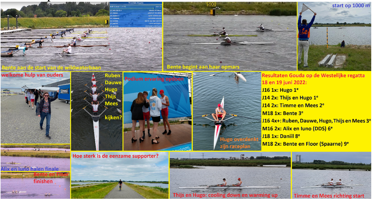 Tijdens de Westelijke Regatta op de Willem-Alexanderbaan in Zevenhuizen op 18 en 19 juni 2022 zijn wederom 2 overwinningen geboekt door Goudse roeiers. Hugo (14) won in de skiff voor 16-jarigen en samen met Thijs (14) won hij in de dubbeltwee voor 14-jarigen. Daarnaast boekte Bente (17) een morele overwinning door de woelige baren te trotseren en keurig als derde in de skiff voor 18-jarigen te eindigen.