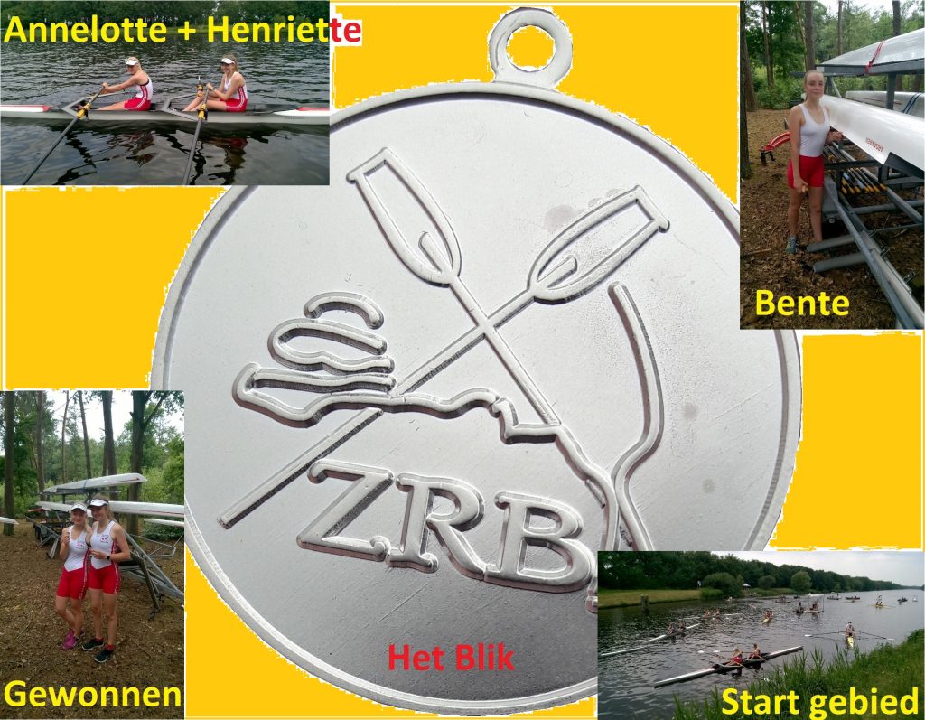Zondag waren de dubbeltweeën aan de beurt. Omdat de organisatie moeite had met het grote aantal inschrijvingen moest er ’s ochtends eerst een tijdrace over 1500 m geroeid worden. De vier snelsten roeiden ’s-middags de finale. Bente, weer met een meisje van ARZV, roeide naar een verdienstelijke 8e plaats in een veld van 14 ploegen. Henriette en Annelotte wonnen de tijdrace en deden dat in de finale nog eens dunnetjes over. Met ruim 8 seconden voorsprong werd overtuigend het 3e blik van het weekend binnen gehengeld.