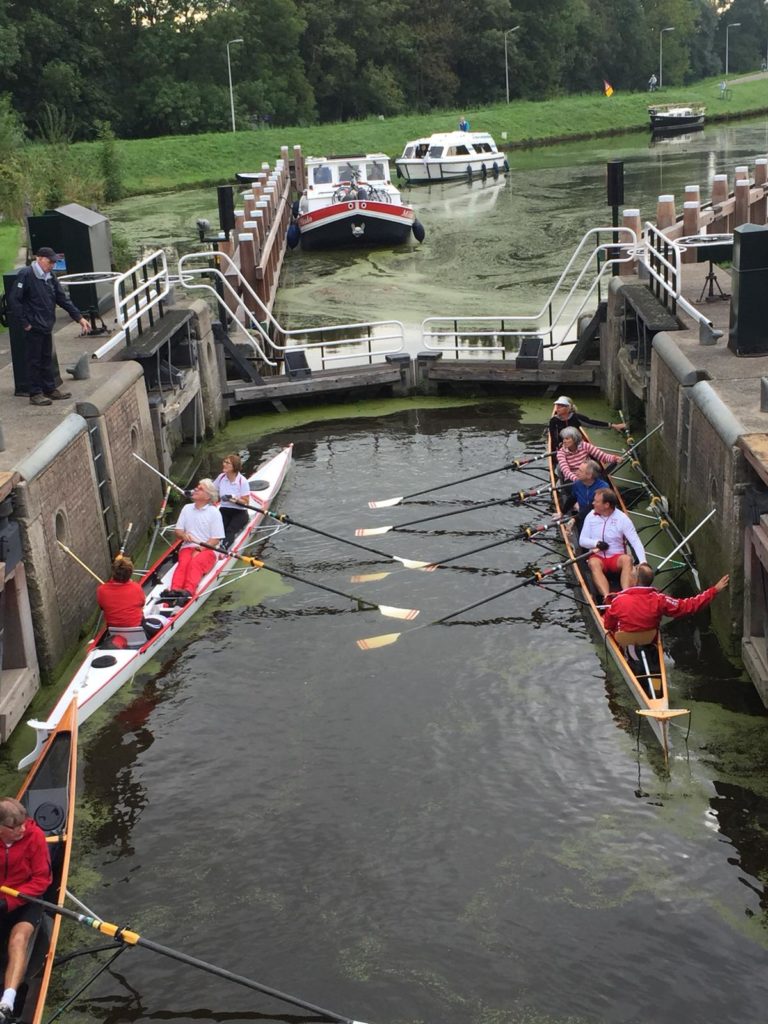 Het was een prachtige dag met veel zon en een stevig windje. Het eerste deel roeiden we, na de Breevaart, dwars door Gouda. In het begin passeerden we veel sluizen. Altijd spektakel en een hoop plezier. Daarna via de Hollandse IJssel naar Oudewater, waar we even de benen konden strekken en een kop koffie hebben gedronken.