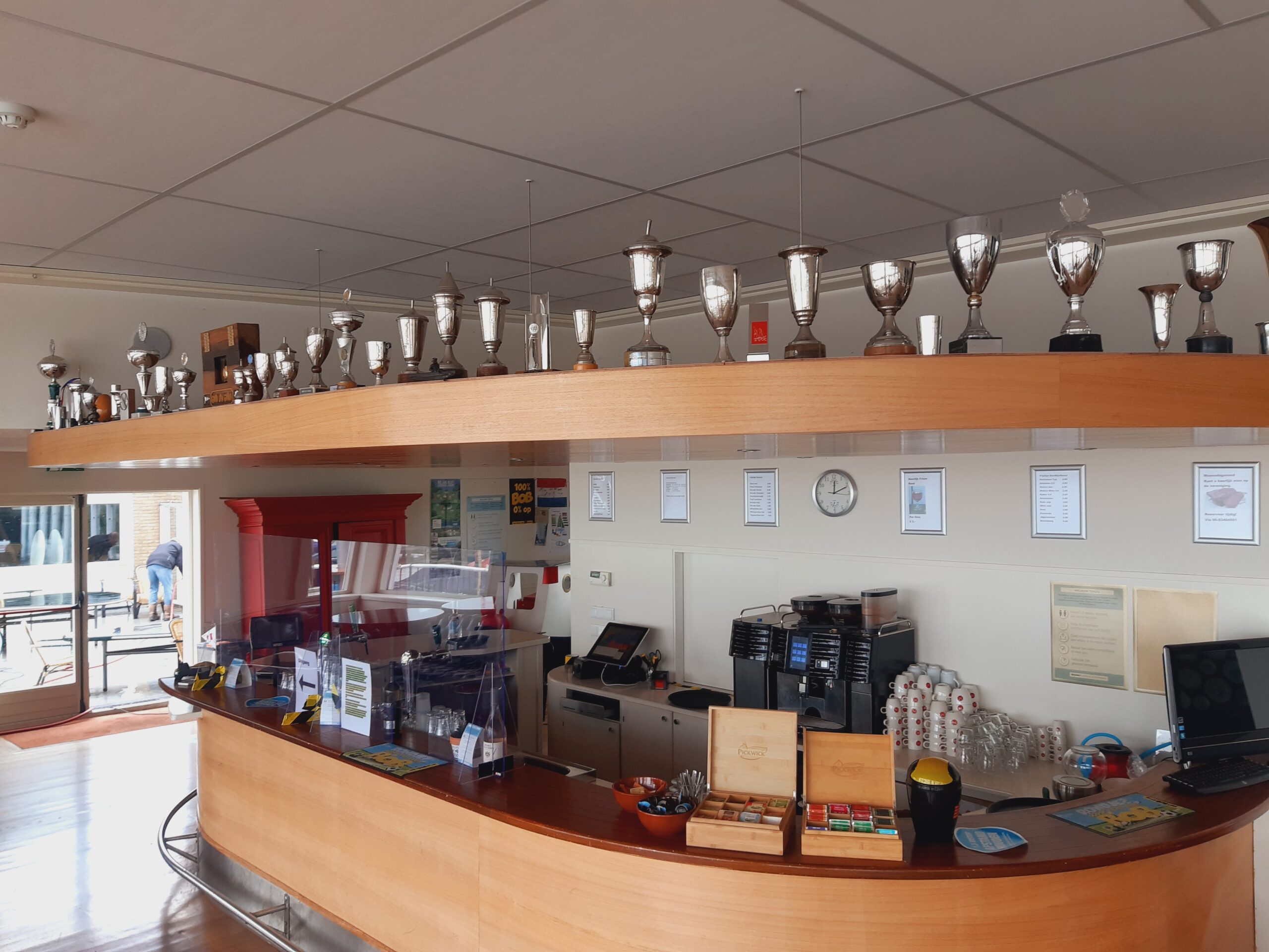 Ook vele zilveren en verzilverde bekers zijn gepoetst en voor iedereen zichtbaar permanent tentoongesteld boven de bar.