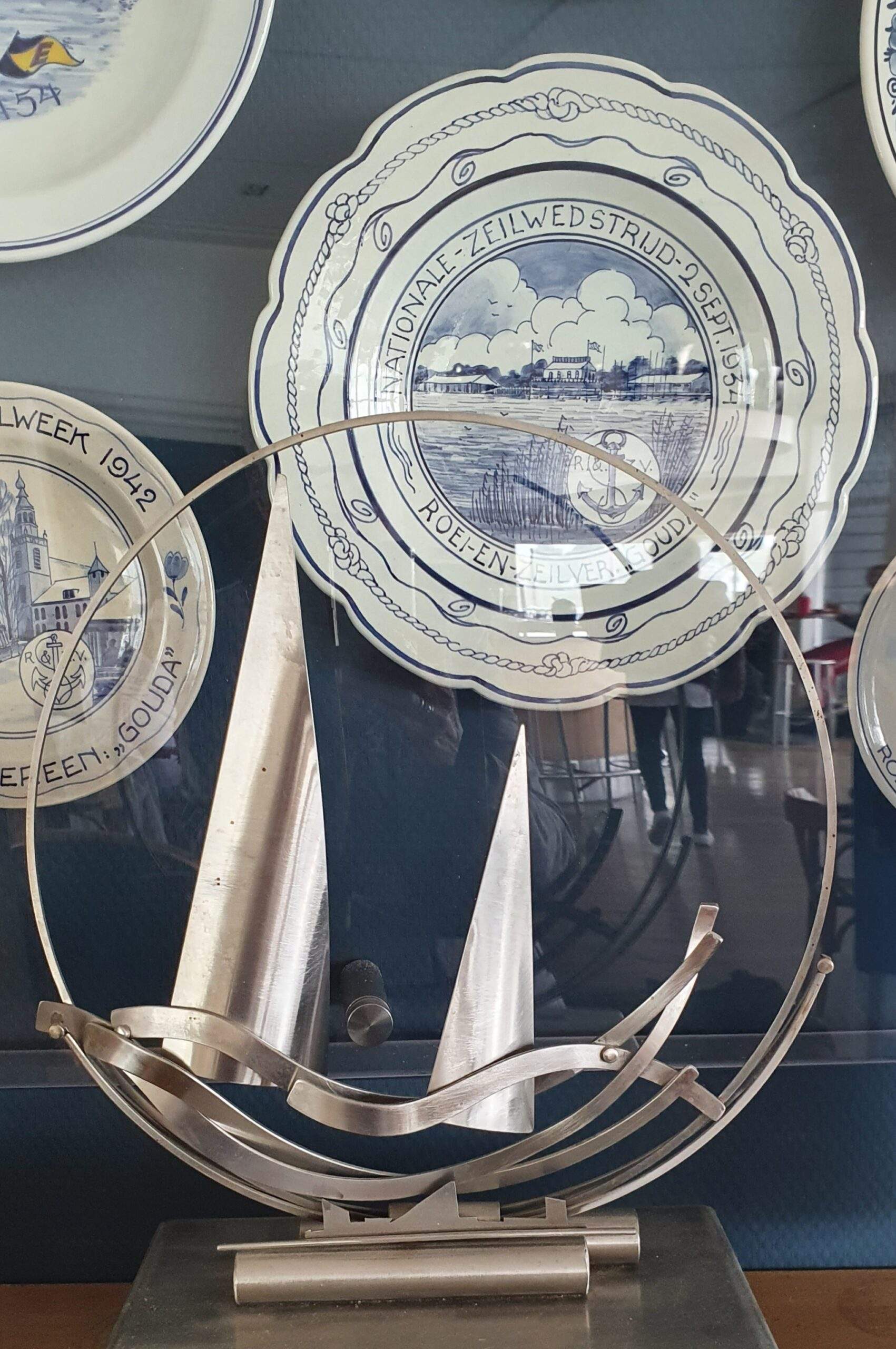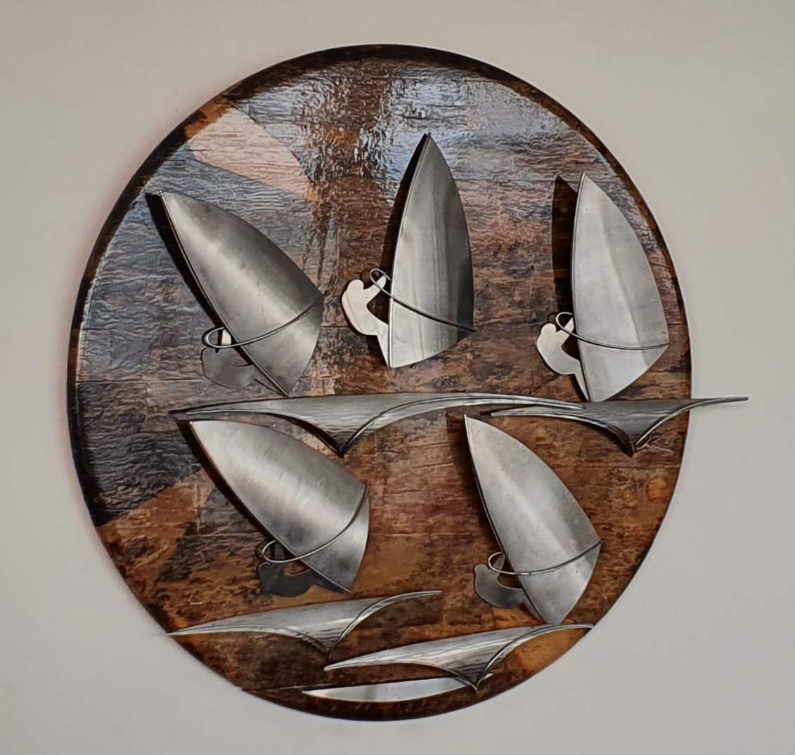 Onze RZVG bezit werk van Menno Meyer: rechts naast het raam met uitzicht op de Breevaart hangt een groot rond houten wandbord met surfers van roestvrijstaal (gesigneerd en gedateerd 1982) en op de haardplaat staat een cirkelvormig object met zeilen op golven, uitgevoerd in hetzelfde materiaal. Misschien kan onze archiefcommissie ‘Oud Goud’ nog eens in het archief op zoek gaan ter gelegenheid waarvan deze objecten van Menno zijn aangeschaft. In ieder geval zijn de objecten een dierbare herinnering aan een bijzondere Goudse kunstenaar!