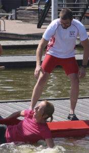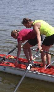 Gecontroleerd en met hulp vanaf de kant, indien het nodig was, zijn alle aanwezige leerlingskiffeurs omgegaan én weer in de skiff geklommen, ondanks dat sommige riemen in de blub bleven hangen. Voor degenen die extraatjes wilden, zijn er nog leuke capriolen uitgehaald. Overstappen van de ene skiff naar de andere, staan in je skiff, applaus voor jezelf en staand strijken. Veiligheid kwam ook aan bod. Marcel heeft uitgelegd hoe je reddend zwemt en hoe je een drenkeling netjes uit het water haalt (drie keer dippen en eruit trekken, let op handzetting). En Jenneke heeft haar eerste zwemmende skiffles gegeven, best lekker met temperaturen rond de 30 graden.