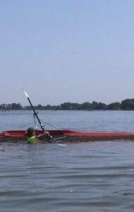 Om de leerlingskiffeurs de vaardigheid van omslaan en weer terug in de skiff klimmen te laten ondergaan, was op zaterdag 8 juli 2023 bij de vereniging een oefenmoment.