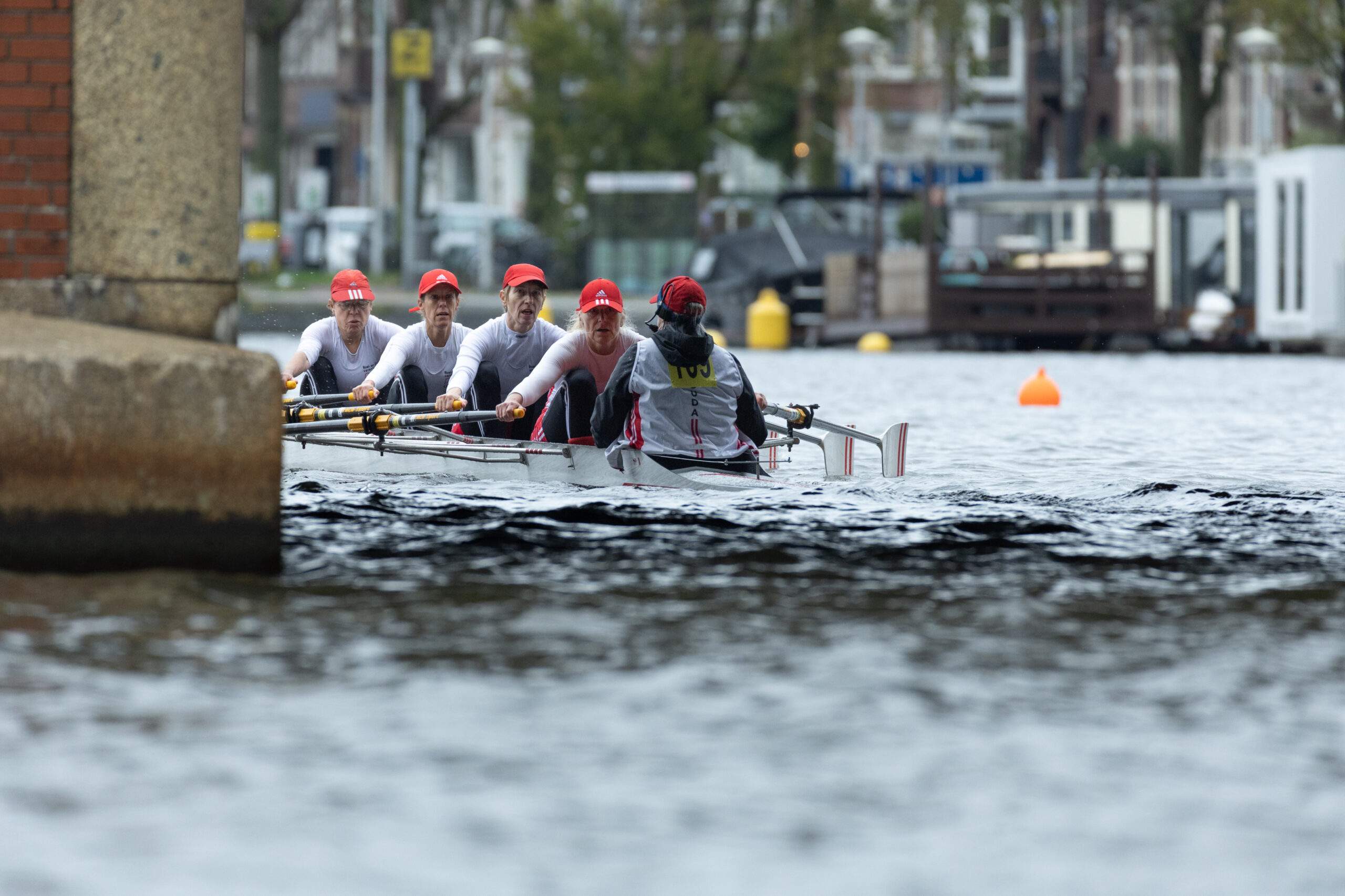 Op zondagochtend om 10:30 lagen we met een grote groep vieren, jeugd, boord en ook 46 dames mastervieren, klaar voor de start. En zeker 30 minuten later nog steeds. Wat bleek achteraf, er moest een vrachtboot even tussendoor. Net als een regenbui, helaas. Wat waren we koud toen we van start gingen! Als nr. 109 konden wij eindelijk beginnen met onze 3 kracht, 3 tempo en 10 halen door om op snelheid over de startlijn te gaan, ter hoogte van het Kalfje aan de Amstel. Christine op slag, Mariette en Yvette in het midden en Marjo op boeg.