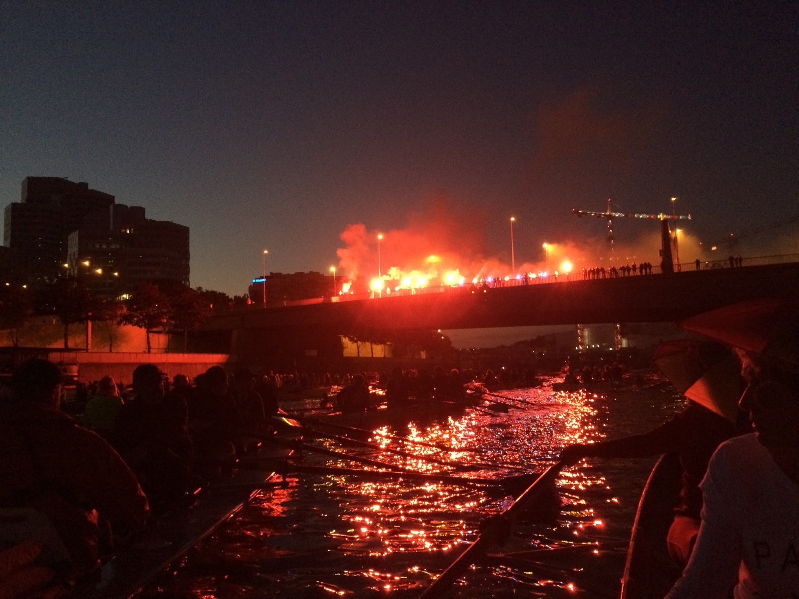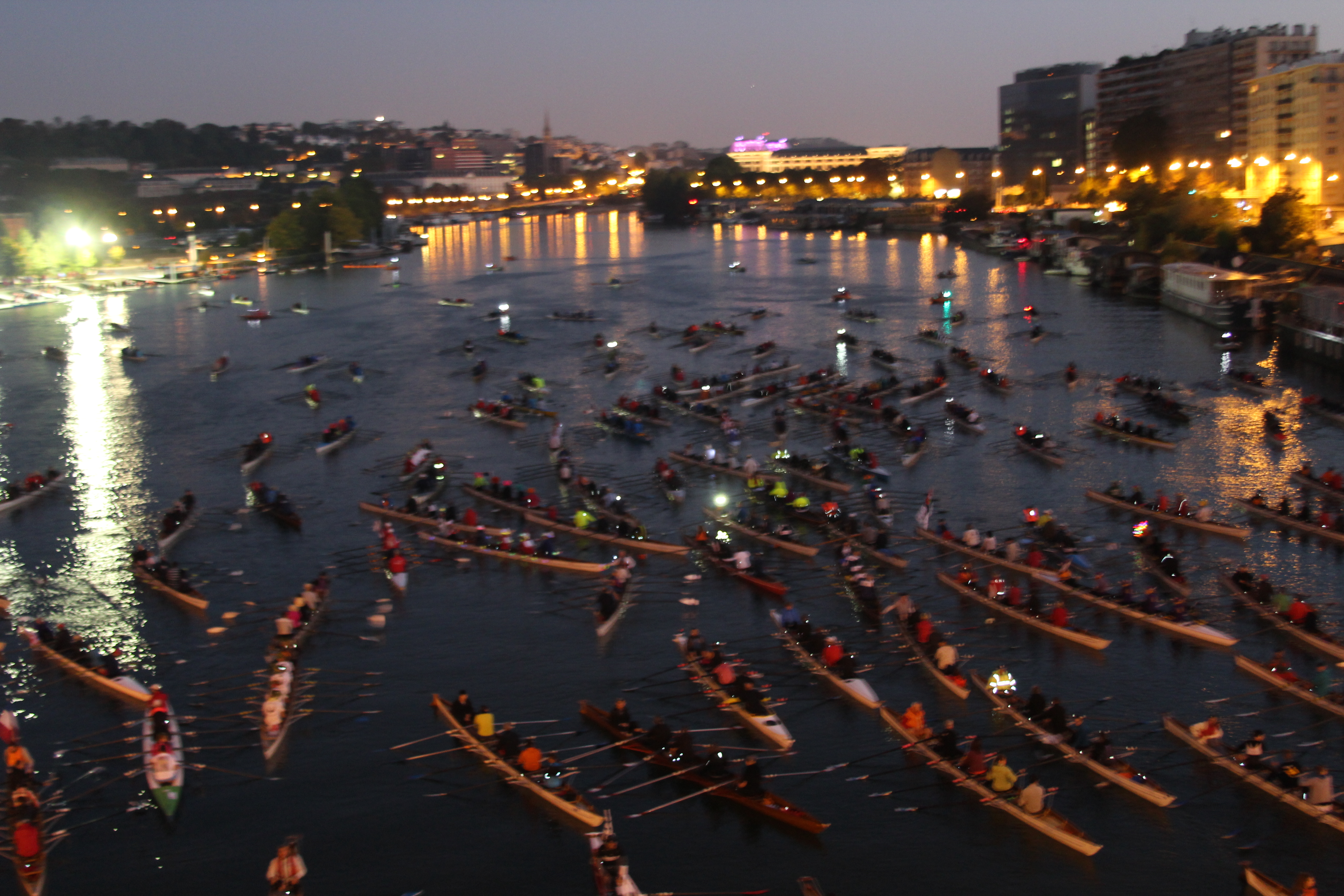 De wekker stond om 4.45 uur! Gelukkig was het goed weer en na een half uurtje lopen bleken we niet de eersten die op de vereniging aanwezig waren. Maar liefst 215 boten en ruim 1000 deelnemers, veel Fransen uiteraard, maar ook boten uit onder andere Italië, Duitsland, Zwitserland, Engeland en Schotland, waren aanwezig en moesten in krap een uur te water. De organisatie ter plaatse was geweldig, onze boot was razend snel te water, en toen moest op het startschot worden gewacht. Dat kwam met vuurwerk in de Franse driekleur om exact 7.00 uur. Zo’n start in het donker is wel een chaos, maar als er eenmaal kan worden geroeid gaat het voortvarend, langs de Eiffeltoren, langs de Notre Dame, je kijkt je ogen uit.