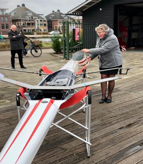 Els is al jaren begaan met onze roei-jeugd en is een zeer ervaren jeugdinstructeur. Door haar werd de nieuwe skiff ‘Bendoe’ gedoopt met een emmertje water uit de Breevaart waar deze skiff regelmatig zal varen. Deze jeugdskiff is geschikt voor < 60 kg en een skiff2 diploma is vereist om deze te kunnen afschrijven.