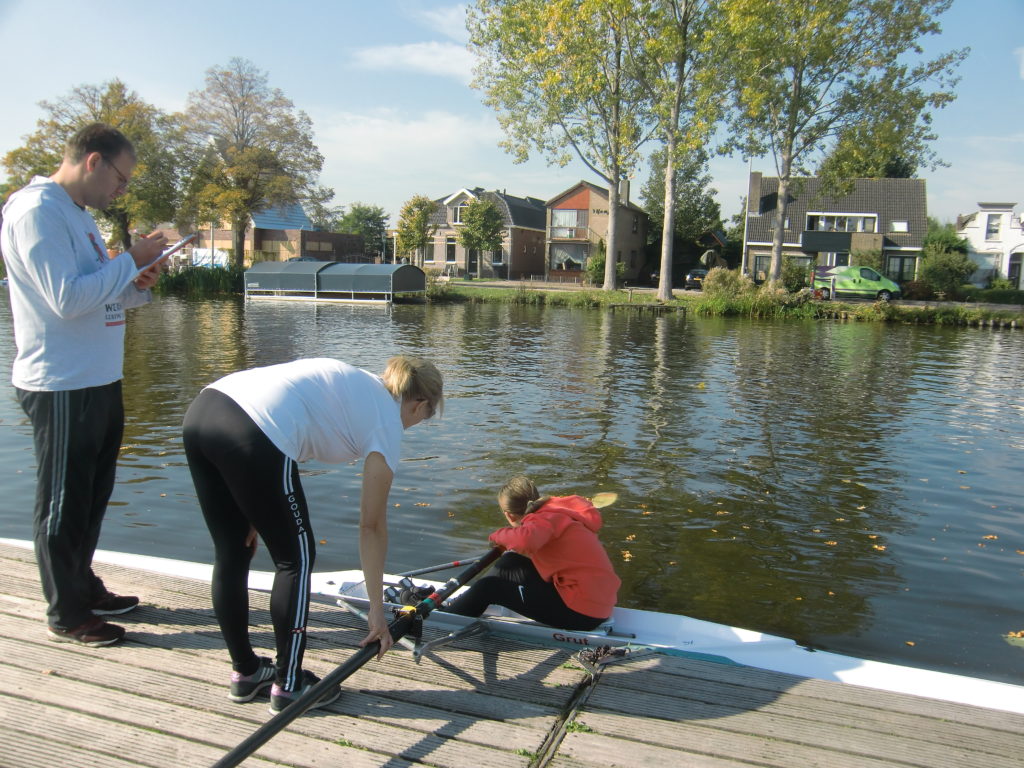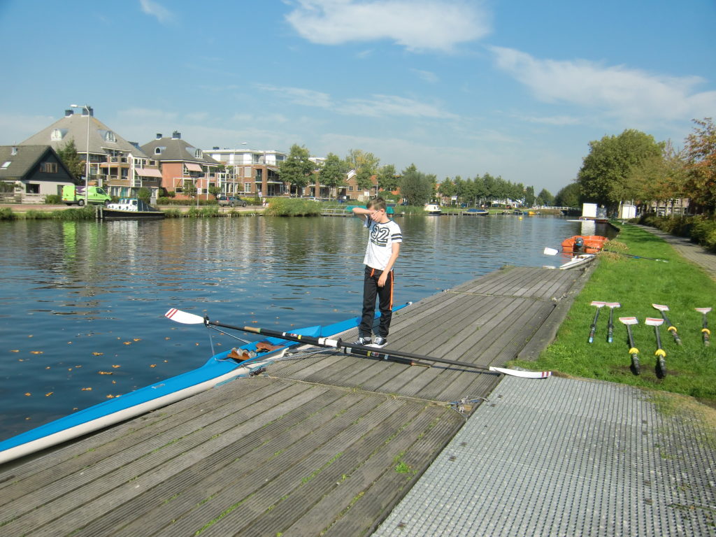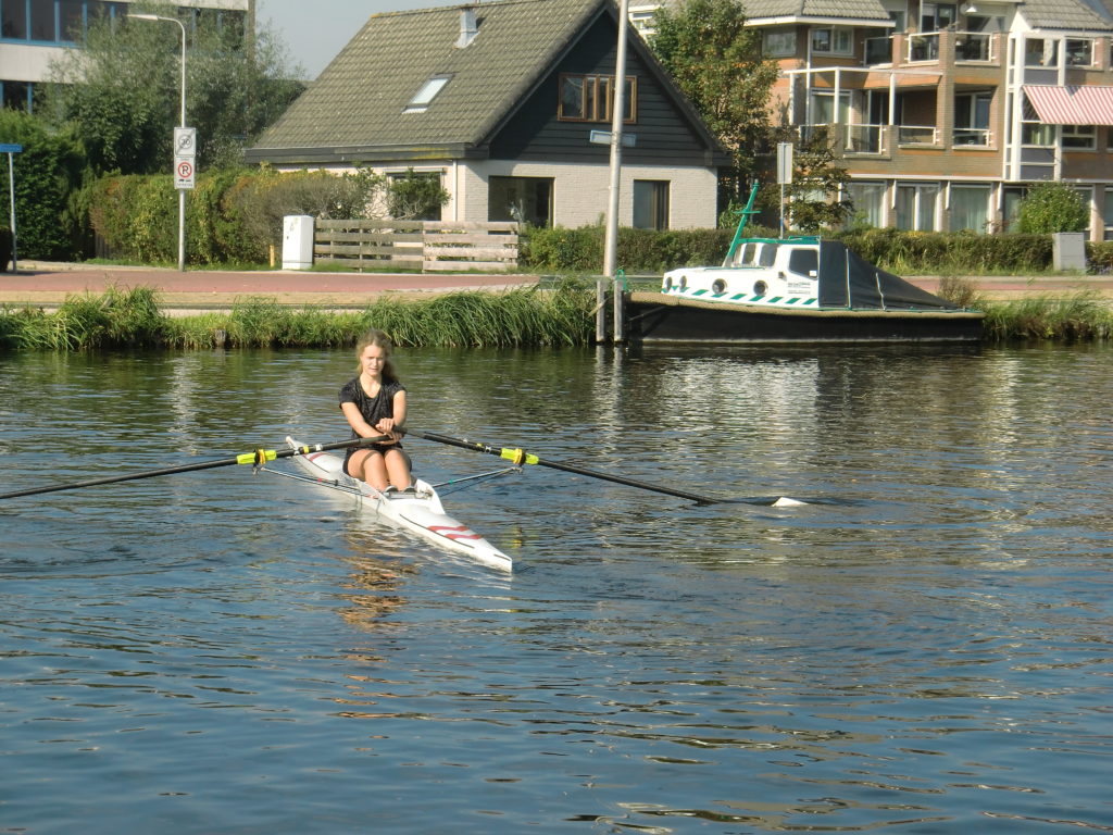 Natuurlijk, er waren af en toe ‘gaat dit goed komen?’ en ‘ik houd mijn adem in!’ momenten. Bijvoorbeeld toen één van onze roeiers van de zenuwen achterstevoren in de boot wilde stappen en verbaasd naar de voetenbank keek, zich langzaam realiserend dat je daar echt niet op kan zitten…. O ja, andersom!! Of toen een andere roeier prachtig slippend door het midden van het poortje roeide, waarbij één riem toch even bleef steken, en hij daardoor de riem moest loslaten. Even was er wat verbazing in de ogen. Aan de wal hield iedereen de adem in… gaat de boot om? Maar nee, geen enkele paniek, geheel in controle werd de riem weer opgevist en werd er rustig verder geroeid. Uit ervaring kan ik zeggen dat het menig volwassen skiffeur niet gelukt zou zijn om zo ‘cool’ te blijven!