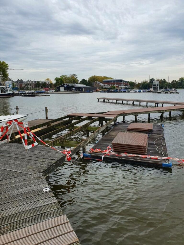 Afgelopen winter hebben we 30 m2 dekken van de zeilsteigers vervangen door glasvezelversterkte kunststofroosters; dit als test. Deze test is de afgelopen zomer positief beoordeeld. Er is dan ook besloten om de dekken van alle vaste steigers de komende winter te gaan vervangen, in totaal 400 m2. Het betreft alleen de dekken, omdat de kwaliteit van de palen en de liggers voldoende is om naar verwachting nog enkele tientallen jaren mee te kunnen gaan. De verwachting is dat, tegen de tijd dat de palen en de liggers vervangen moeten worden, de roosters die we nu aanbrengen daarna nog vele jaren meekunnen.