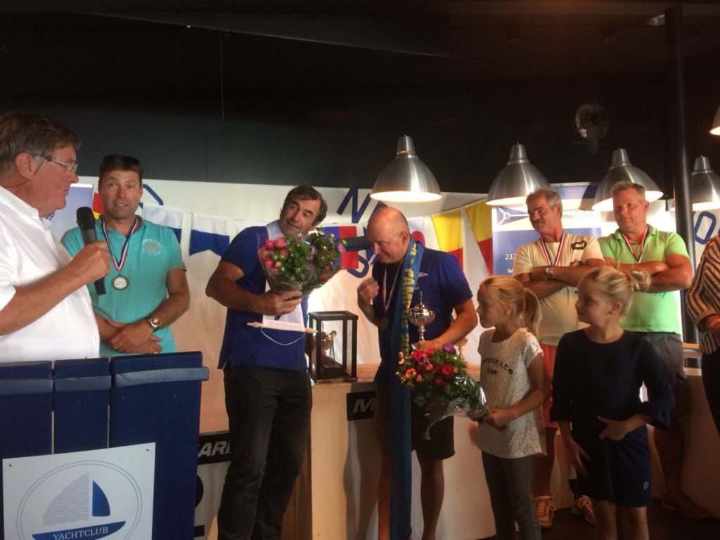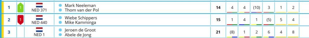 Na een aantal spannende wedstrijden met zeer sterk draaiende en wisselende windsterkten ging het -na 2 dagen wachten vanwege het ontbreken van wind– op zondag uiteindelijk tussen de NED371 van Mark Neeleman met als bemanning Thom van der Pol, en de NED440 met Wiebe Schippers en Mike Kamminga waarbij Mark en Thom het kampioenschap met een 1 en een 2 veilig wisten te stellen.
