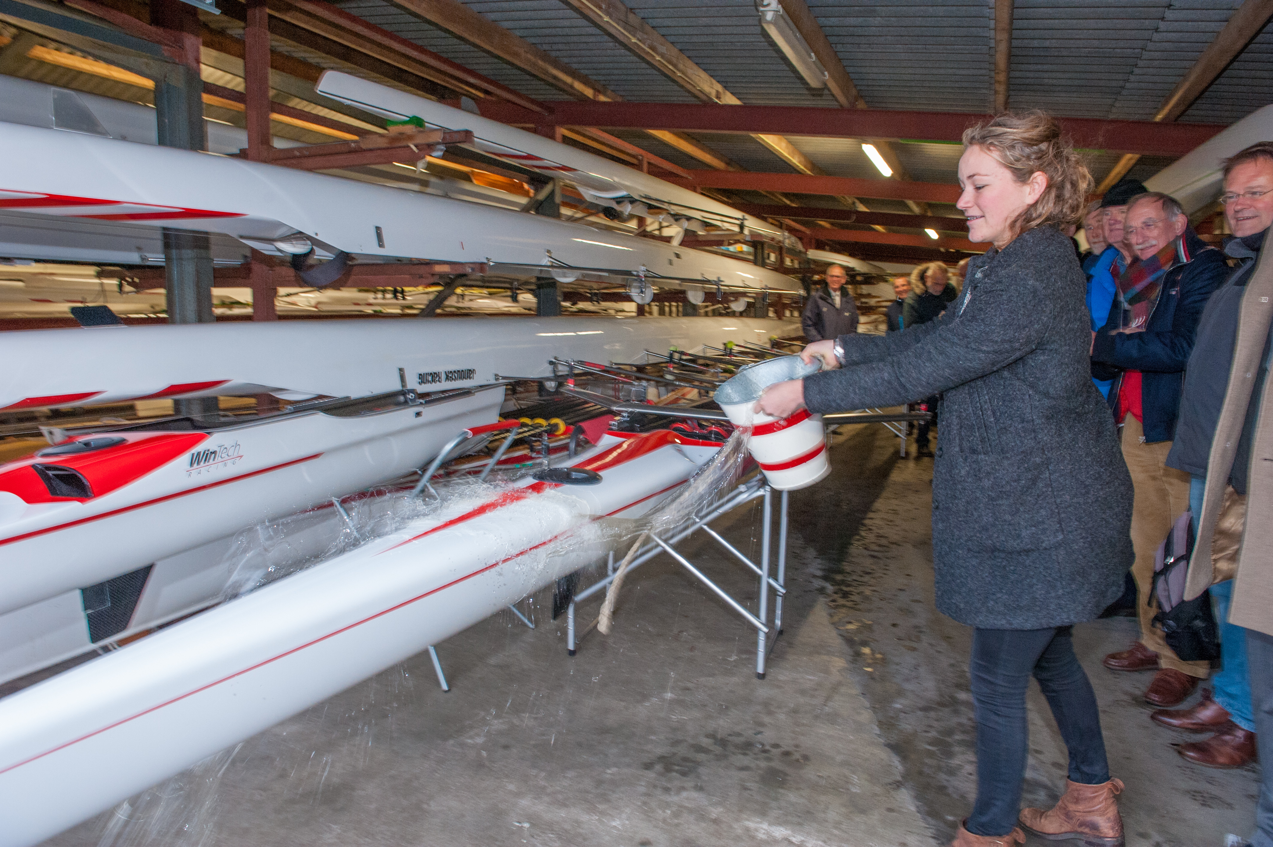 Allereerst werden twee nieuwe roeiboten gedoopt. Vanwege de stevige wind werd dit overdekt gedaan. De nieuwe gladde vier (een multifunctionele boot die zowel skull als boord geriggerd kan worden en middels een verwisselbaar puntje zowel gestuurd als ongestuurd kan worden ingezet) werd door wedstrijdzeilster Emma de Fraiture gedoopt. De boot luistert naar dBotendoop nov 2015e naam “rode wouw”, een roofvogel.